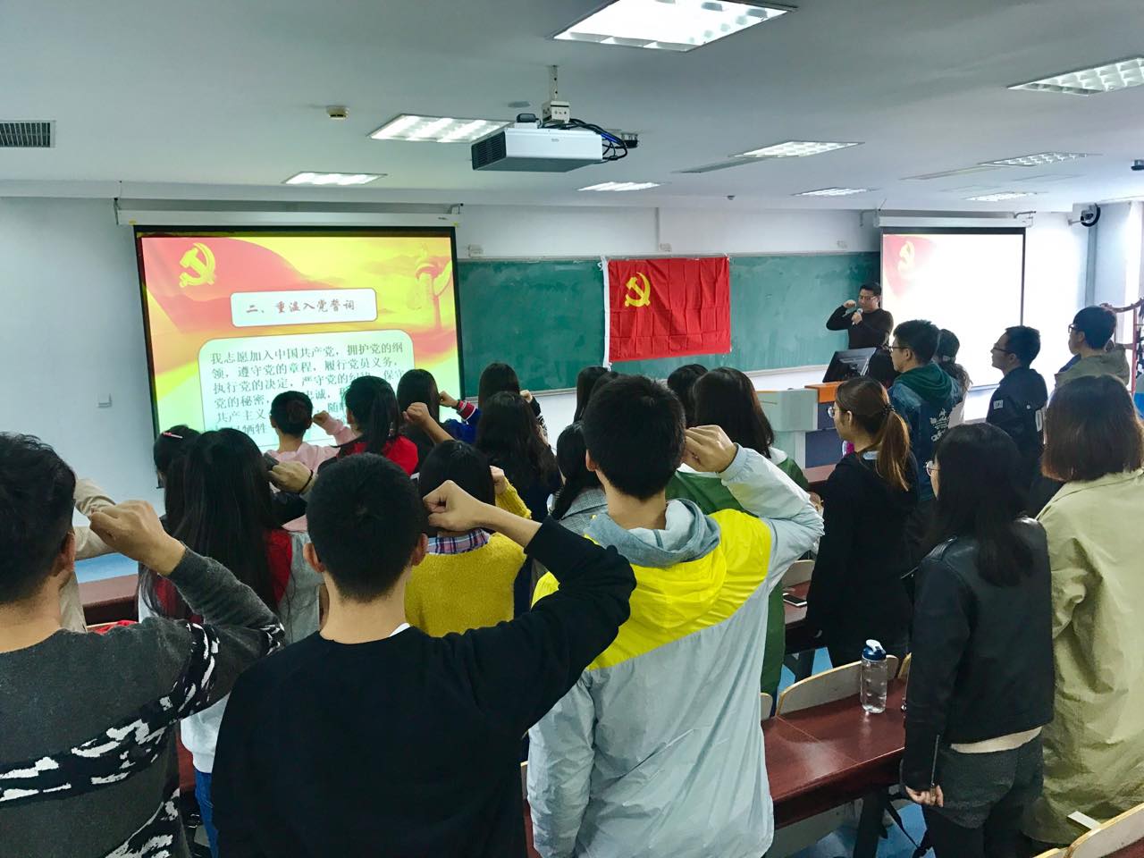 2017年10月17日上午,为迎接党的十九大胜利召开,球友会2017级硕士研究生4个党支部在沙河西区403教室联合举办了主题为“争做先锋党员,重温入党誓词”的主题党日活动,参加此次活动的有公司党委书记樊勇老师,组织员李飞霞老师,宣传委员庞淑芬老师以及2017级全体研究生党员。