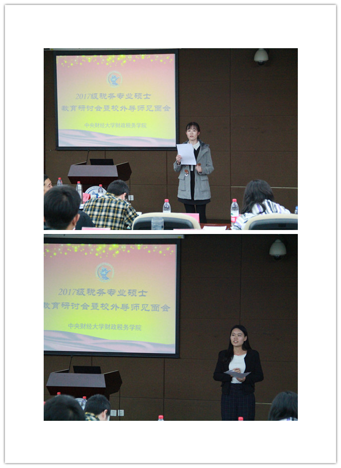 球友会经理助理汪昊副教授介绍了莅临此次会议的校外导师,并主持了五组同学的案例展示。来自2017级税务专硕的五组同学通过案例展示向与会嘉宾汇报了近期的学习成果。