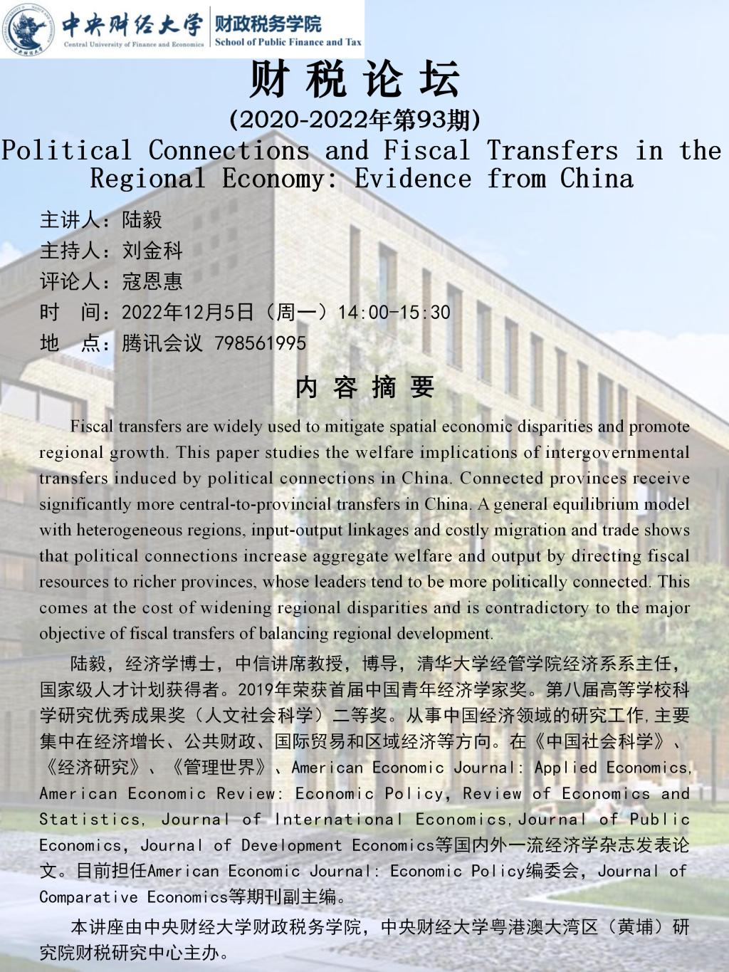 【财税论坛】Political Connections and Fiscal Transfers in the Regional Economy: Evidence from China